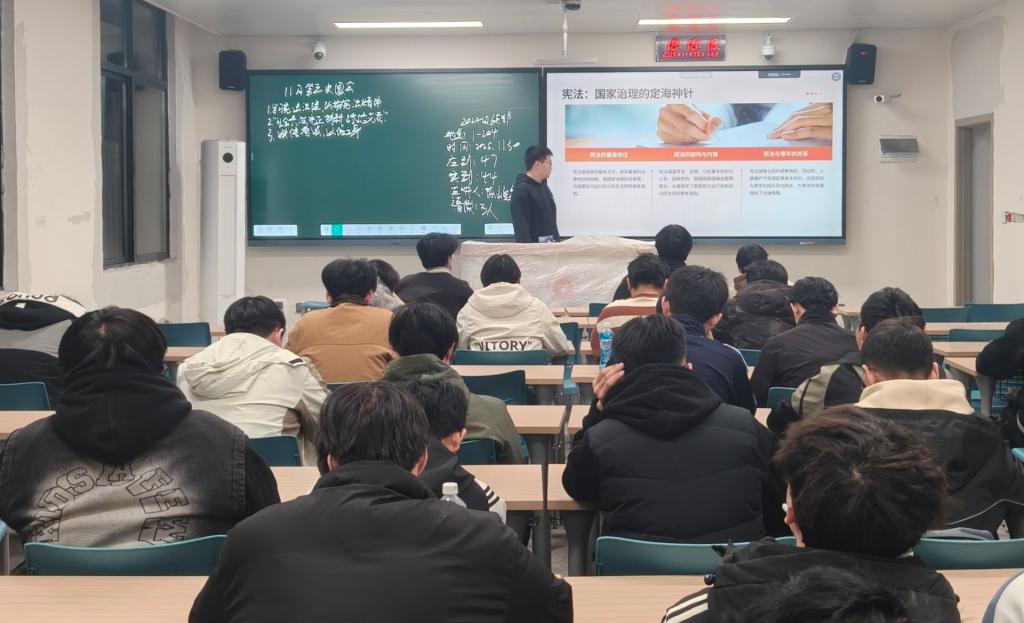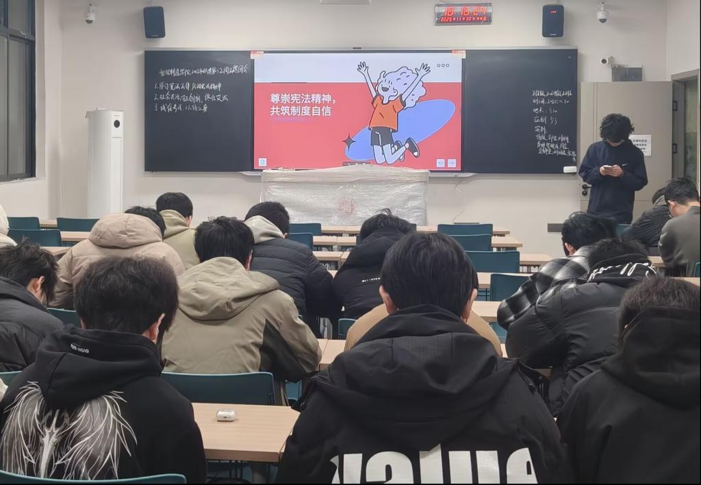 在宪法学习环节,各团支部通过领学原文、案例分析、交流研讨等形式,深入学习了宪法作为国家根本大法的核心地位与重要意义,并了解了宪法中关于国家制度、公民基本权利与义务的关键内容。随后同学们围绕“如何做宪法的忠实崇尚者、自觉遵守者、坚定捍卫者”展开热烈讨论,并表示将把宪法精神内化于心、外化于行,为推进中国式现代化法治建设贡献青春智慧和力量。