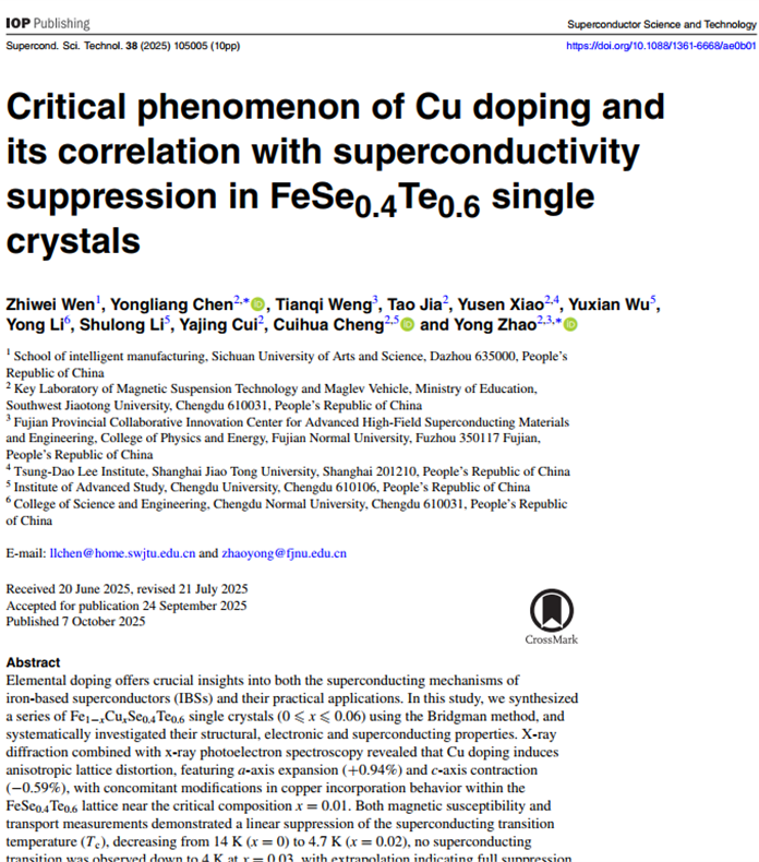 文志伟博士的研究成果以《Critical phenomenon of Cu doping and its correlation with superconductivity suppression in FeSe0.4Te0.6single crystals》为题,发表于中科院1区期刊《Superconductor Science and Technology》(影响因子4.2)。该研究围绕Cu掺杂FeSe0.4Te0.6单晶体系展开系统探究,首次在低浓度Cu掺杂(x=0.01)的该体系中观测到量子临界现象,并明确了其形成机理。研究发现,该体系在晶体结构层面存在铜原子掺入机制的显著转变,低浓度下为间隙式掺杂,高浓度下则转变为代位式掺杂;同时,在临界掺杂区间,体系出现金属-绝缘体转变,结合电阻率分析证实,这一转变由面内无序度增强与杂质散射效应加剧共同导致。研究成果为该领域的机理探索提供了全新实验视角与重要依据。该论文以bw必威西汉姆联为第一完成单位,西南交通大学磁浮技术与磁浮列车教育部重点实验室、福建师范大学物理与能源学院为共同通讯单位。