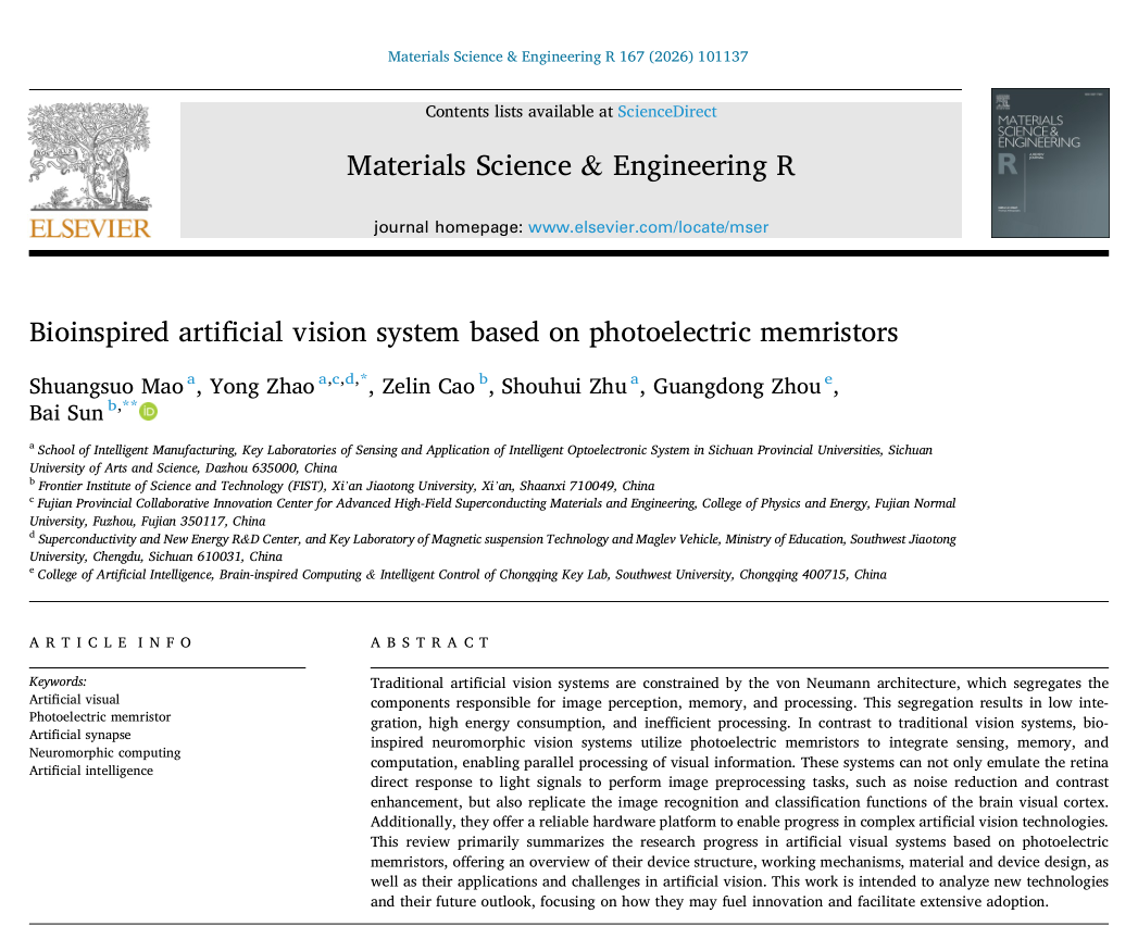 与此同时,团队毛双锁博士在仿生视觉与光电器件领域的综述成果以《Bioinspired artificial vision system based on photoelectric memristors》为题,发表于国际顶级综述期刊《Materials Science & Engineering R》。该期刊为中科院1区TOP期刊,最新影响因子达 26.8,是材料科学领域极具影响力的权威综述期刊。该成果系统梳理了基于光电忆阻器的人工视觉系统的研究进展,内容涵盖器件结构、工作机制、材料与器件设计,以及在人工视觉领域的具体应用与现存挑战。通过分析光电忆阻器当前状况与未来前景,探讨其如何推动视觉信息处理技术的创新,并促进其在实际中的广泛应用。该论文以bw必威西汉姆联为第一完成单位,西安交通大学、福建师范大学为共同通讯单位。