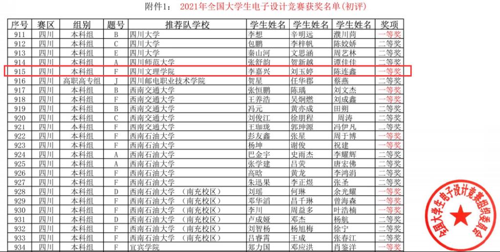 近日,TI杯2021年全国大学生电子设计竞赛(全国竞赛)评审结果揭晓,我院李嘉兴、刘玉婷、陈连鑫同学的作品荣获全国一等奖。