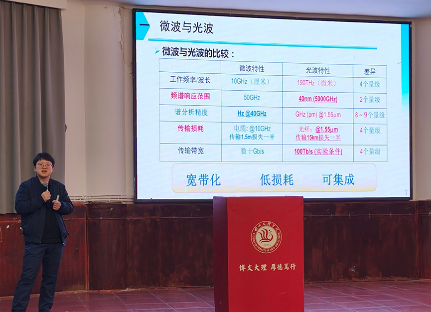 报告中,杨锋副研究员聚焦光子技术与微波信号处理的交叉领域,系统阐述了光电子器件在高速微波信号生成、传输及处理中的关键作用,并分享了团队在光子集成芯片、超宽带信号调控等方向的最新研究成果。他通过案例分析,揭示了该技术在6G通信、雷达探测及智能传感等领域的应用潜力。