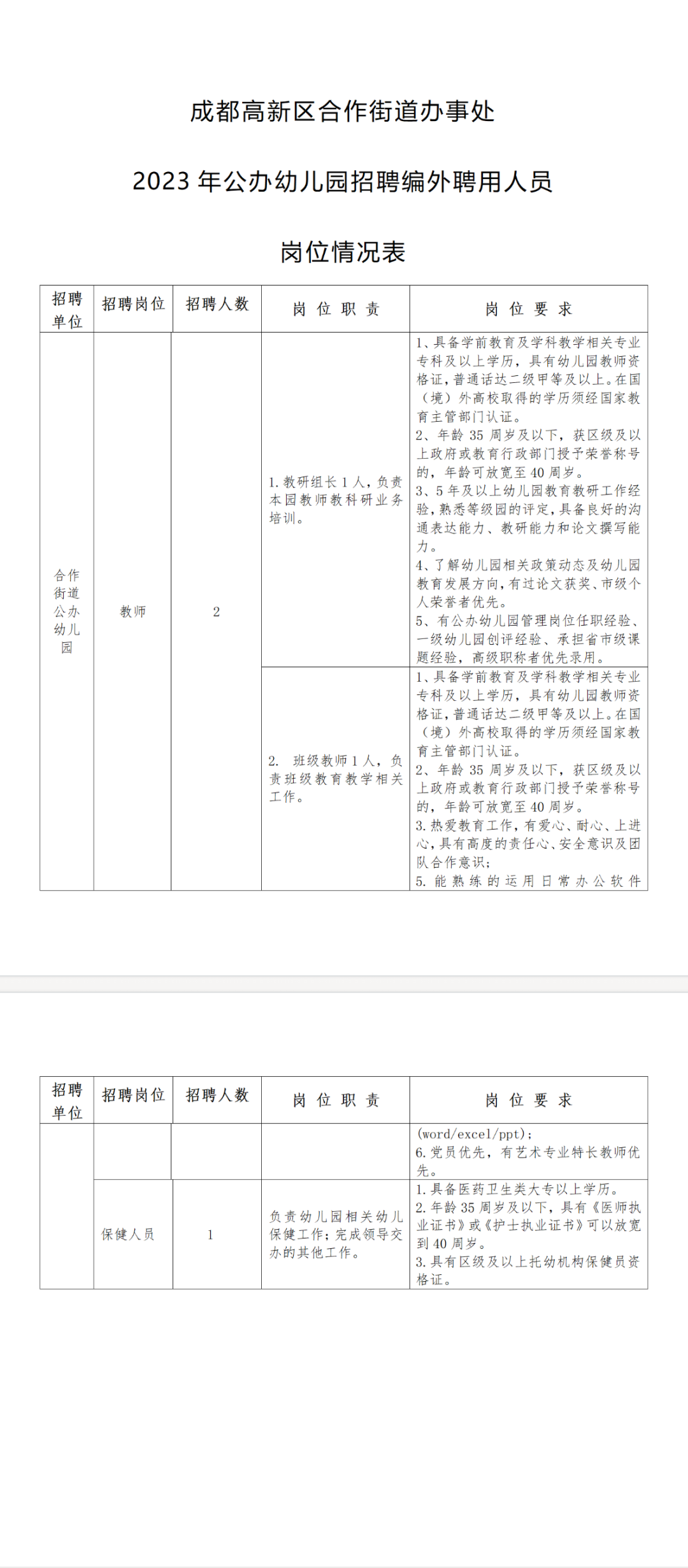 因工作需要,成都高新区合作街道公办幼儿园现面向社会招聘编外人员3名(无编制、合同制人员)。现将有关事项公告于下:
