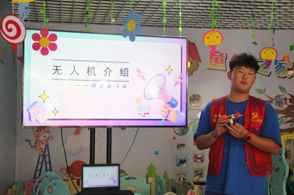 第一节课由掌握无人机固定翼知识的成员通过ppt演示、视频播放的方式为小朋友讲解什么是无人机?无人机为什么会飞?无人机能做什么?由浅入深,运用生活中的例子,将原本深奥晦涩的无人机知识变得通俗易懂。为充分调动小朋友们的学习热情,在讲解过程授课成员穿插互动提问环节,大家积极参与回答问题,现场氛围热烈。理论课程结束后,利用双引擎滑行飞机模型指导小朋友识别、识记组成飞机所需部件及名称,进而引导学生独立完成机身组装。