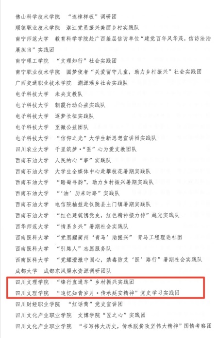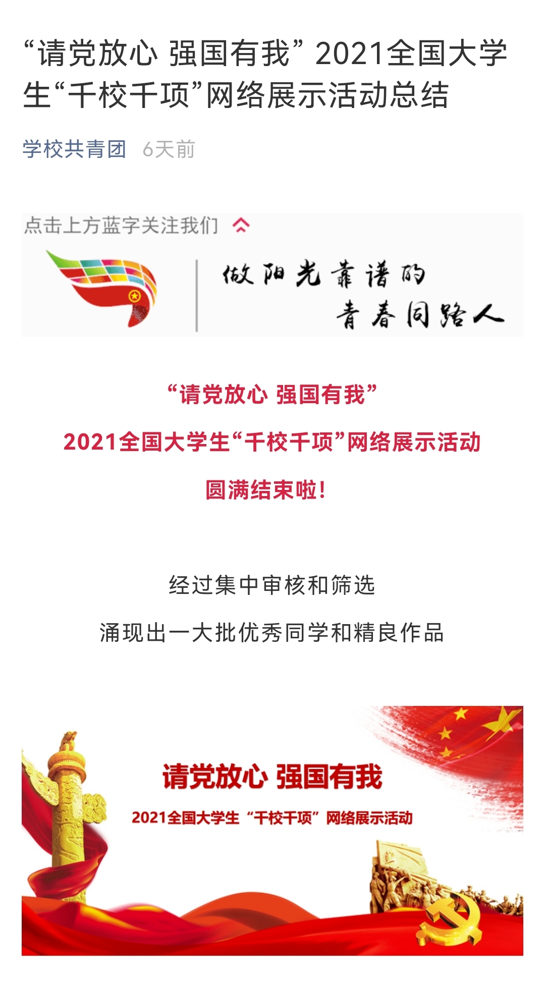近日,由共青团中央宣传部指导,中国青少年新媒体协会、中青在线共同主办的全国大学生“千校千项”网络展示活动中,我院《“锋行直通车”乡村振兴实践团》和《“追忆知青岁月·传承延安精神”党史学习实践团》 2项社会实践活动成功入选,入选名单分别在学校共青团和中华全国学联微信公众号上公布。这是“锋行直通车”志愿服务品牌项目继2019年荣获全国大学生暑期社会实践优秀团队,再一次入选团中央暑期社会实践活动项目遴选。