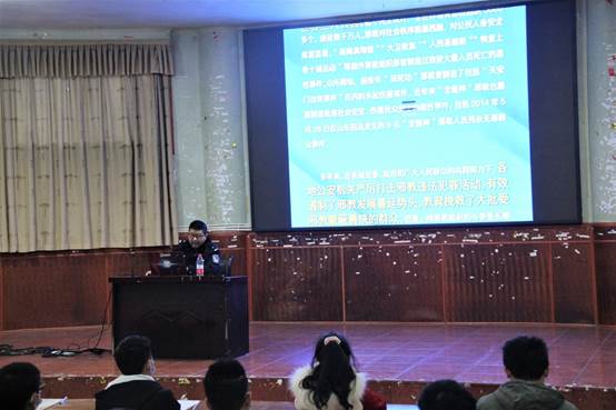 青春无邪,远离邪教。本次讲座从传播科学思想、普及科学知识、弘扬科学精神入手,为青年学生成才、成长保驾护航,努力引导青年学生做社会主义核心价值观的坚定信仰者、积极传播者、模范践行者。公安局党委委员董飞在讲座中说道:“邪教主要通过网络与境外沟通,其组织结构松散不严谨。作为学生要注意防范邪教,不信教,要从小事做起,不断提高自身的鉴别能力,识破骗局。”