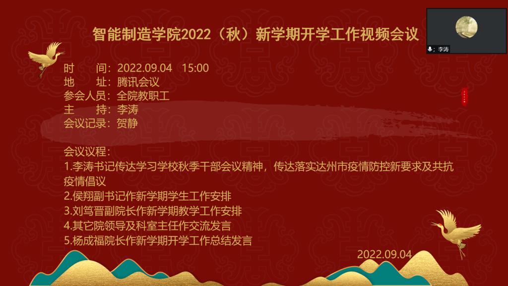 2022年9月4日下午,我院通过网络形式召开新学期开学工作视频会议,党总支书记李涛传达落实了学校2022年秋季干部培训会议精神和达州市疫情防控新要求,院长杨成福做上学期工作总结并对新学期的工作进行了详细部署,学院全体教职工参加了会议。