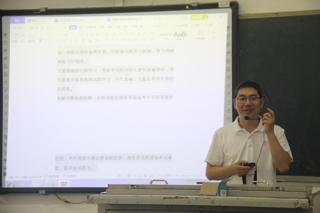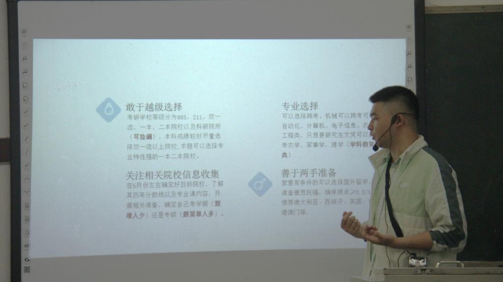 本次大会一共分为三项。第一项由学生代表为修业班同学献花。献花仪式意在表达同学们对师兄师姐的祝贺与敬佩。大会第二项为考研经验分享。此环节由邱建高优秀学子分享考研经验。邱建高就院校选择、备考时间安排、考试科目准备、踩过的坑、减压方式、心态调整等几方面为大家讲述自己的经验与见解。其中他觉得院校的选择要至关重要,一定要先了解目标院校的各种方面后再做决定,正所谓考得好不如选的好。而就如何选择课程老师这个问题,他们表示适合自己的才是最好的,要根据自身情况去考虑网课老师。然后从考研上岸的例子,让同学们了解更多院校,且为同学们提高信心。大会第三项是由曾强老师进行的宣讲。他表示考研不像大家想象的那么难,要先选好想考的学校并分清楚自己要考方向,再去做准备。从往届的考研数据分析,告诉准备考研的同学,考研虽有难度,但只要有付出就一定有收获,所以极力推荐大家去尝试。