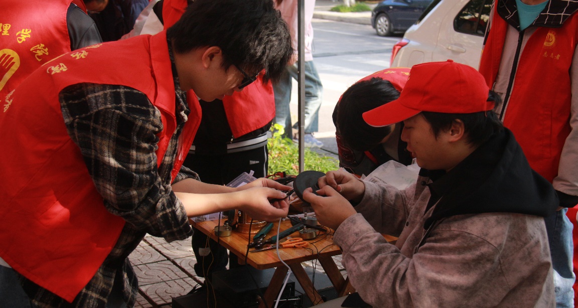 在11月2日“义务维修”活动期间,志愿者在学府雅苑社区设立了维修站点,为社区居民提供了免费的家电维修服务。志愿者们分工明确,善于沟通的志愿者负责将居民带来维修的物品登记在册并及时反馈维修结果,有维修经验擅长动手的志愿者则负责处理电器问题。维修范围涵盖电饭煲、电风扇、吹风机、烧水壶等小型家用电器,维修人员运用所学知识,成功解决了很多居民带来的家电故障问题。维修过程中,志愿者还向居民们传授了家电的保养方法和简单维修技巧,提高了居民们的家电使用安全意识。