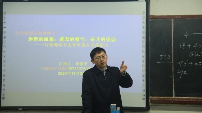 为全面落实立德树人根本任务,进一步建立和完善领导干部与学生直接沟通交流的机制,切实做到领导干部深入学生中去,指导学生健康成长,努力形成全员全过程全方位育人的工作局面。11月24日,我校李国荣馆长、郝加波主任应邀来到我院分别参与物理学专业、电子科学与技术专业主题班会,并就考研形势与专业学习作了分享。