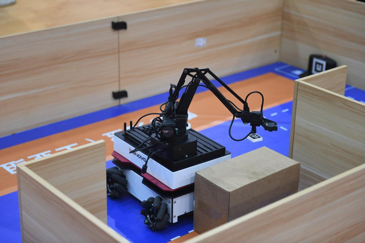 在物流小车项目区,一组来自西南石油大学的团队带来的“智能物料分拣机器人”成为焦点——只见机器人通过视觉识别系统精准定位不同颜色、形状的物料,机械臂以毫米级精度完成抓取、搬运与分类投放,全程仅用1分10秒便完成复杂流水线任务,其流畅的动作与高效的算法引得现场评委频频点头。